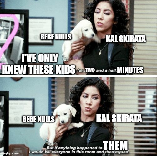 I SO ADORE how Kal is also bloodthirsty but trying to be a responsible person here for the sake of the children. :D